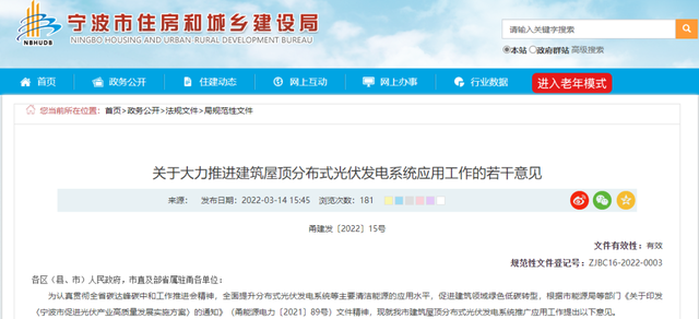 3月14日,浙江寧波城鄉(xiāng)住建局發(fā)布《關(guān)于大力推進(jìn)建筑屋頂分布式光伏發(fā)電系統(tǒng)應(yīng)用工作的若干意見》。意見稱:到2025年底,建筑屋頂安裝分布式光伏發(fā)電工作全面推進(jìn),力爭15%以上的建筑屋頂設(shè)置分布式光伏發(fā)電系統(tǒng),90%以上新建建筑全面落實分布式光伏發(fā)電系統(tǒng),建筑領(lǐng)域分布式光伏裝機容量占全社會累計光伏并網(wǎng)容量超過60%。