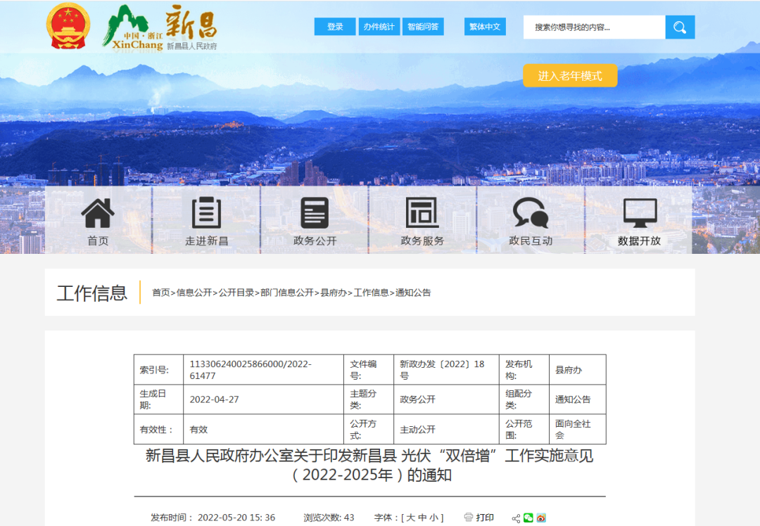 近日,浙江新昌縣人民政府辦公室關(guān)于印發(fā)新昌縣光伏“雙倍增”工作實(shí)施意見(jiàn)(2022-2025年)的通知。