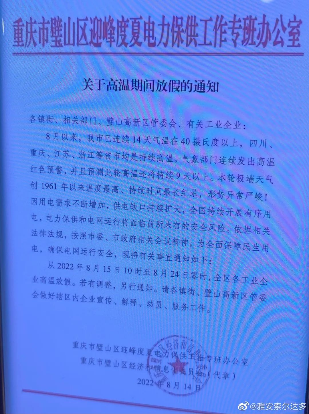 稍早,安徽、浙江、江蘇、四川等多地因高溫酷暑持續(xù)用電緊張,啟動(dòng)有序用電,要求工業(yè)企業(yè)錯(cuò)峰生產(chǎn)、保障民生用電,并發(fā)布節(jié)約用電倡議書(shū)。四川省經(jīng)濟(jì)和信息化廳和國(guó)網(wǎng)四川省電力公司聯(lián)合下發(fā)文件《關(guān)于擴(kuò)大工業(yè)企業(yè)讓電于民實(shí)施范圍的緊急通知》。通知表示,由于當(dāng)前電力供需緊張形勢(shì)進(jìn)一步加劇,為確保四川電網(wǎng)安全,確保民生用電,確保不出現(xiàn)拉閘限電。經(jīng)研究決定,從8月15日起取消主動(dòng)錯(cuò)避峰需求響應(yīng),在全省(除攀枝花、涼山)的19個(gè)市(州)擴(kuò)大工業(yè)企業(yè)讓電于民實(shí)施范圍,對(duì)四川電網(wǎng)有序用電方案中所有工業(yè)電力用戶(hù)(含白名單重點(diǎn)保障企業(yè))實(shí)施生產(chǎn)全停(保安負(fù)荷除外),放高溫假,讓電于民,時(shí)間從2022年8月15日00:00至20日24:00。各地要立即通知企業(yè)做好生產(chǎn)調(diào)整,保障保安負(fù)荷用電,迅速執(zhí)行到位。