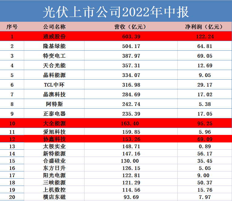 在中報(bào)凈利潤(rùn)榜TOP20中,通威股份、大全能源和協(xié)鑫科技位列“前三甲”,凈利潤(rùn)分別為122.24億元、95.25億元和69.09億元,成為今年上半年最賺錢的3家光伏企業(yè)。