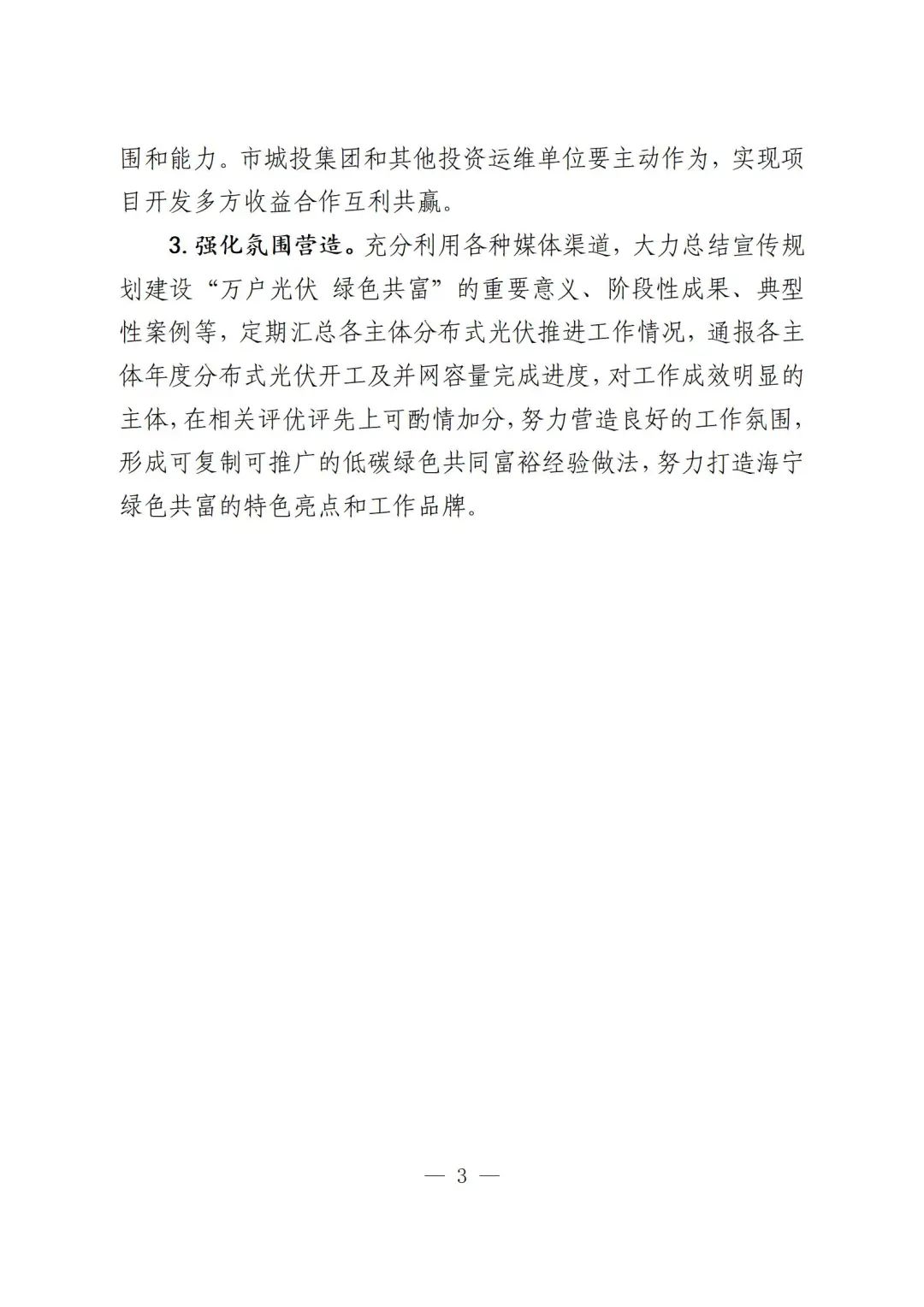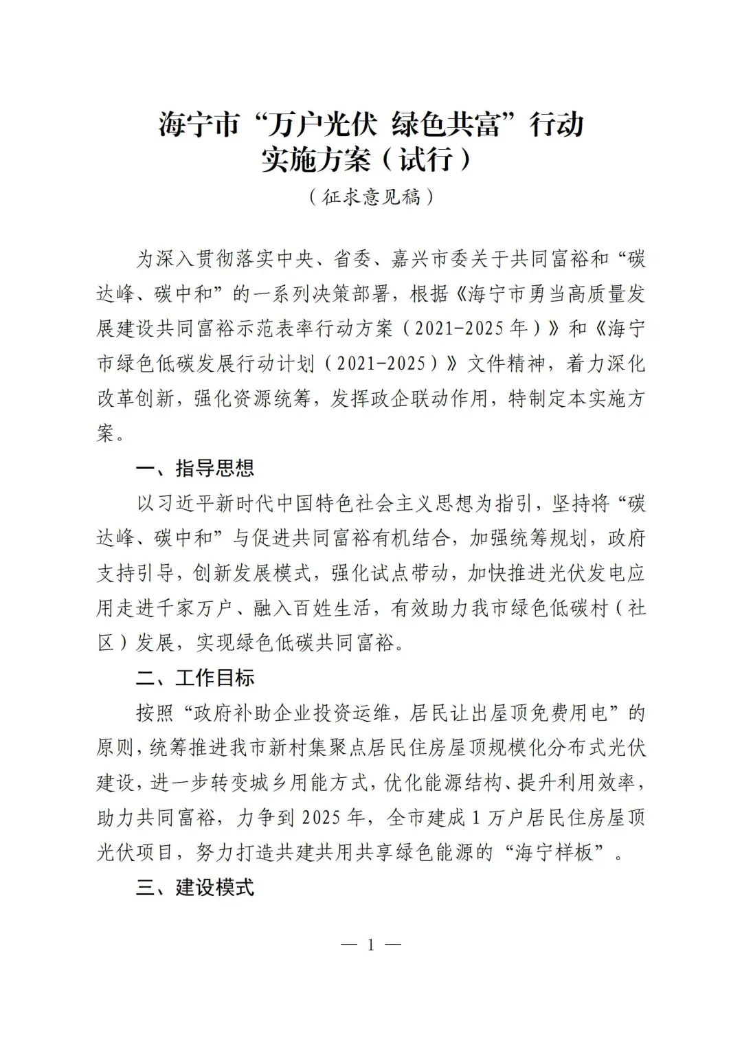 海寧市發(fā)展和改革局近日就《海寧市“萬戶光伏 綠色共富”行動(dòng)實(shí)施方案(試行)》(征求意見稿)公開征求意見,力爭到2025年,全市建成1萬戶居民住房屋頂光伏項(xiàng)目,努力打造共建共用共享綠色能源的“海寧樣板”。市、鎮(zhèn)(街道)根據(jù)年度并網(wǎng)戶數(shù)目標(biāo),分別按照裝機(jī)容量每瓦1.2元給予補(bǔ)助。項(xiàng)目建設(shè)資金由投資運(yùn)維單位自籌,待項(xiàng)目驗(yàn)收并審計(jì)完成后,市、鎮(zhèn)(街道)財(cái)政安排補(bǔ)助資金撥付。分布式光伏發(fā)電項(xiàng)目發(fā)電量全部上網(wǎng),發(fā)電收益居民和企業(yè)共享。合同期內(nèi)每戶居民按裝機(jī)容量1千瓦可每月免費(fèi)用電20千瓦時(shí),每千瓦時(shí)按0.538元計(jì)算。
