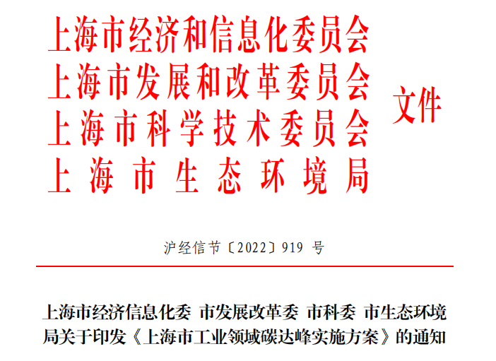 2022年12月8日,?上海市經(jīng)濟(jì)和信息化委員會(huì)、上海市發(fā)展和改革委員、上海市科學(xué)技術(shù)委員會(huì)、上海市生態(tài)環(huán)境局四委局印發(fā)《上海市工業(yè)領(lǐng)域碳達(dá)峰實(shí)施方案》,方案提出: