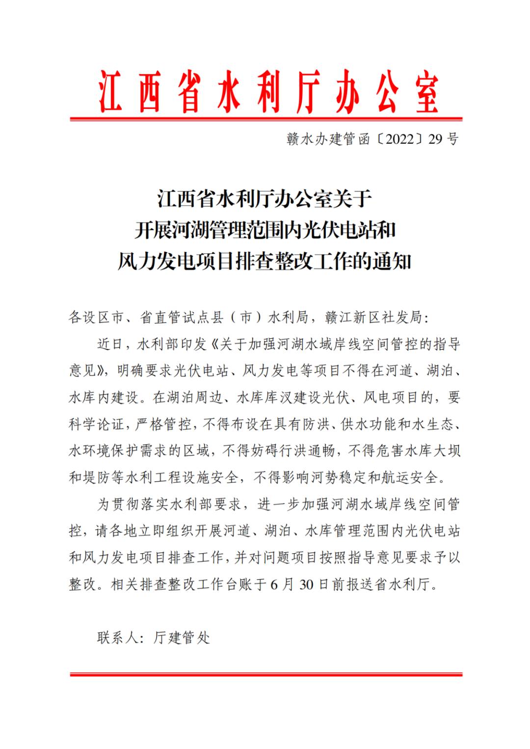 2022年5月27日,江西省水利廳辦公室下發(fā)《關于開展河湖管理范圍內(nèi)光伏電站和風力發(fā)電項目排查整改工作的通知》,要求:
