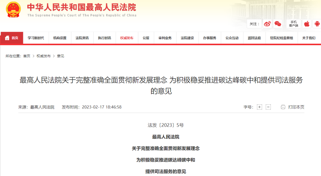 2月17日上午,最高人民法院召開新聞發(fā)布會(huì),發(fā)布《最高人民法院關(guān)于完整準(zhǔn)確全面貫徹新發(fā)展理念 為積極穩(wěn)妥推進(jìn)碳達(dá)峰碳中和提供司法服務(wù)的意見》,多處涉及清潔能源以及企業(yè)的碳排放配額清繳內(nèi)容。