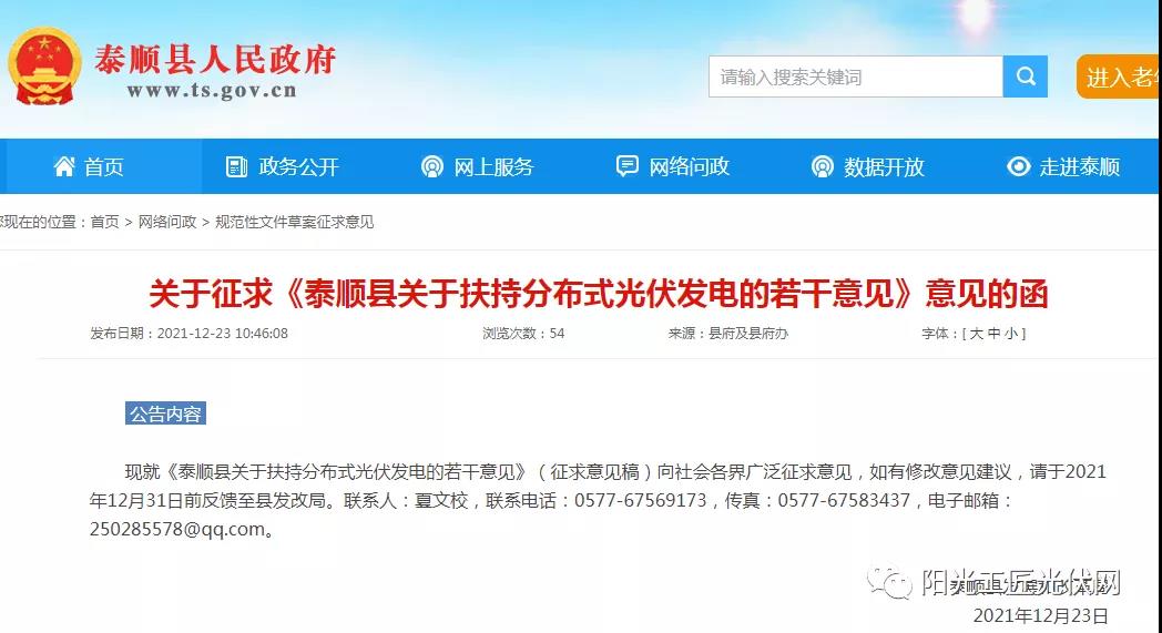 近日,泰順縣人民政府發(fā)布了關(guān)于征求《泰順縣關(guān)于扶持分布式光伏發(fā)電的若干意見》意見的函。