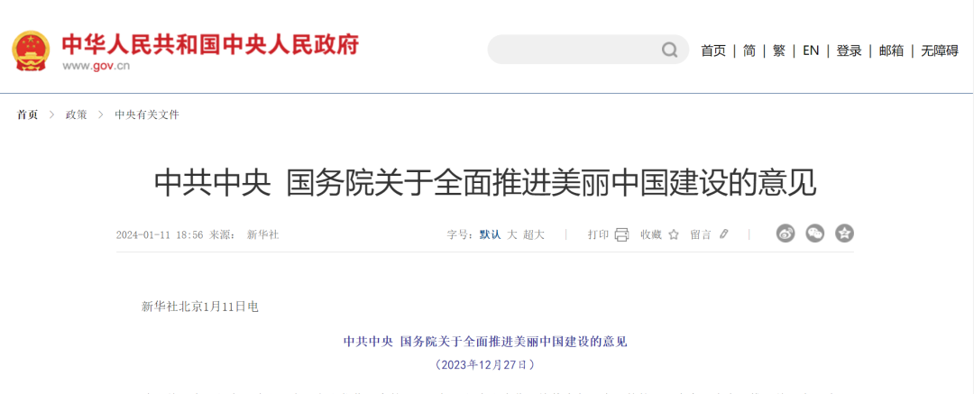 據(jù)最新消息,1月11日,中國政府發(fā)布了《中共中央 國務(wù)院關(guān)于全面推進美麗中國建設(shè)的意見》(以下簡稱《意見》),《意見》指出: