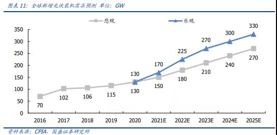 從全球角度看,中國、歐洲、美國是光伏發(fā)展的主要市場,決定了全球的光伏裝機需求。未來幾年,光伏裝機需求快速增長。據(jù)行業(yè)預測,樂觀情形下,2022年全球新增光伏裝機將達到225GW,到2025年將達到330GW。