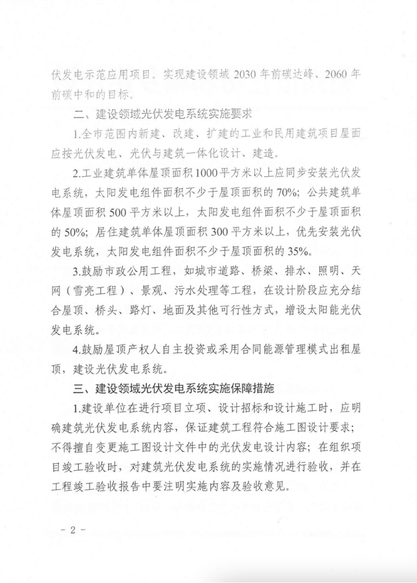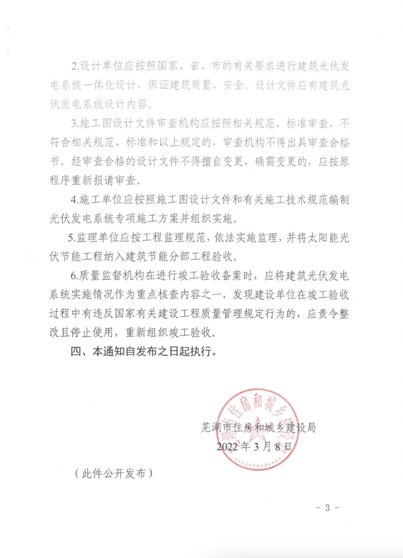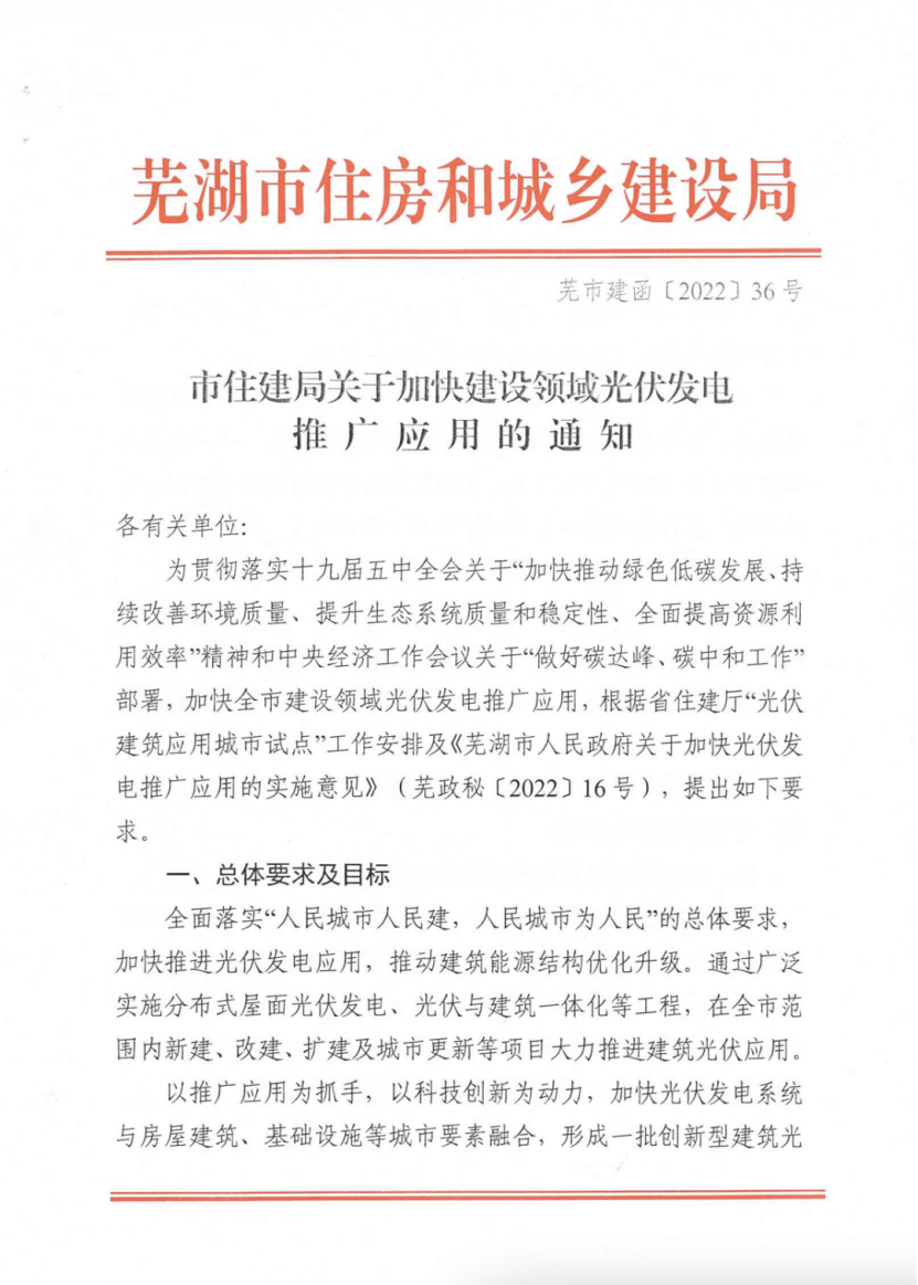 3月10日,安徽蕪湖市住建局發(fā)布關(guān)于加快建設(shè)領(lǐng)域光伏發(fā)電推廣應(yīng)用的通知,通知指出,全市范圍內(nèi)新建、改建、擴建的工業(yè)和民用建筑項目屋面應(yīng)按光伏發(fā)電、光伏與建筑一體化設(shè)計、建造。其中,工業(yè)建筑單體屋頂面積1000平方米以上應(yīng)同步安裝光伏發(fā)電系統(tǒng),太陽發(fā)電組件面積不少于屋頂面積的70%。