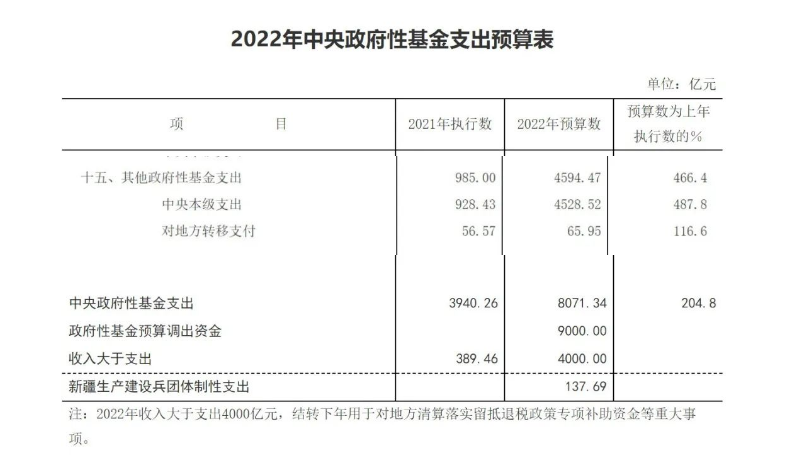 近日了解到,3月25日,財(cái)政部網(wǎng)站發(fā)布《2022年中央政府性基金支出預(yù)算表》,其中“其他政府性基金支出”中“中央本級支出”從2021年的928億元增加至4528億元,增加3600億元,增加比例487.8%!如此幅度之大是不多見的!