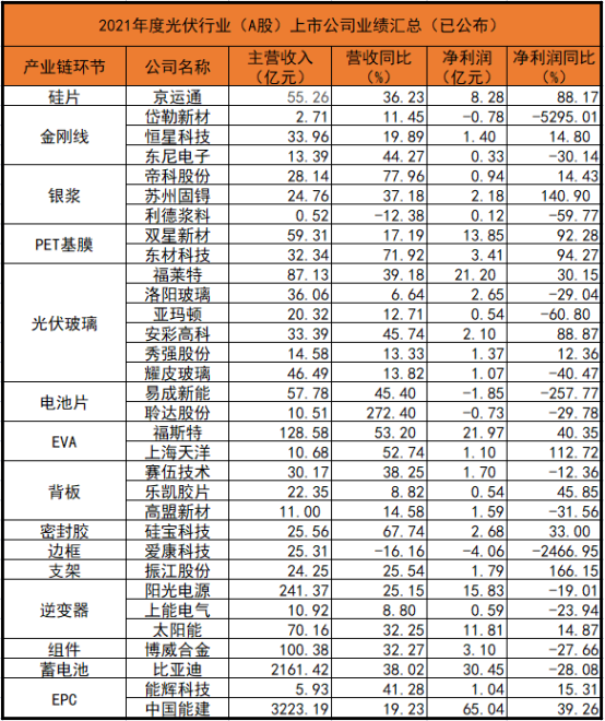 截至發(fā)稿,國內(nèi)光伏企業(yè)中,共有37家A股上市公司公布2021年年報。營收總體保持增長,部分企業(yè)營收爆發(fā)式增長。凈利潤方面表現(xiàn)不一,但上游硅料、鋁材持續(xù)性漲價明顯產(chǎn)生了一定影響,虧損多集中在中游金剛線、電池片、邊框生產(chǎn)制造企業(yè)。