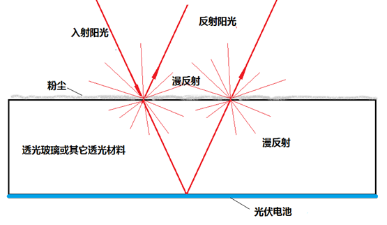 玻璃表面的灰塵不僅會嚴(yán)重影響太陽輻射透射率,還會因為表面灰塵導(dǎo)致照射到光伏組件表面的太陽輻射產(chǎn)生較大的漫反射。據(jù)實驗實測,玻璃表面積累的灰塵將會導(dǎo)致太陽輻射量損失達(dá)到5%-30%,損失主要是由附著在玻璃表面的灰塵對太陽輻射的吸收、反射、和散射作用造成的。